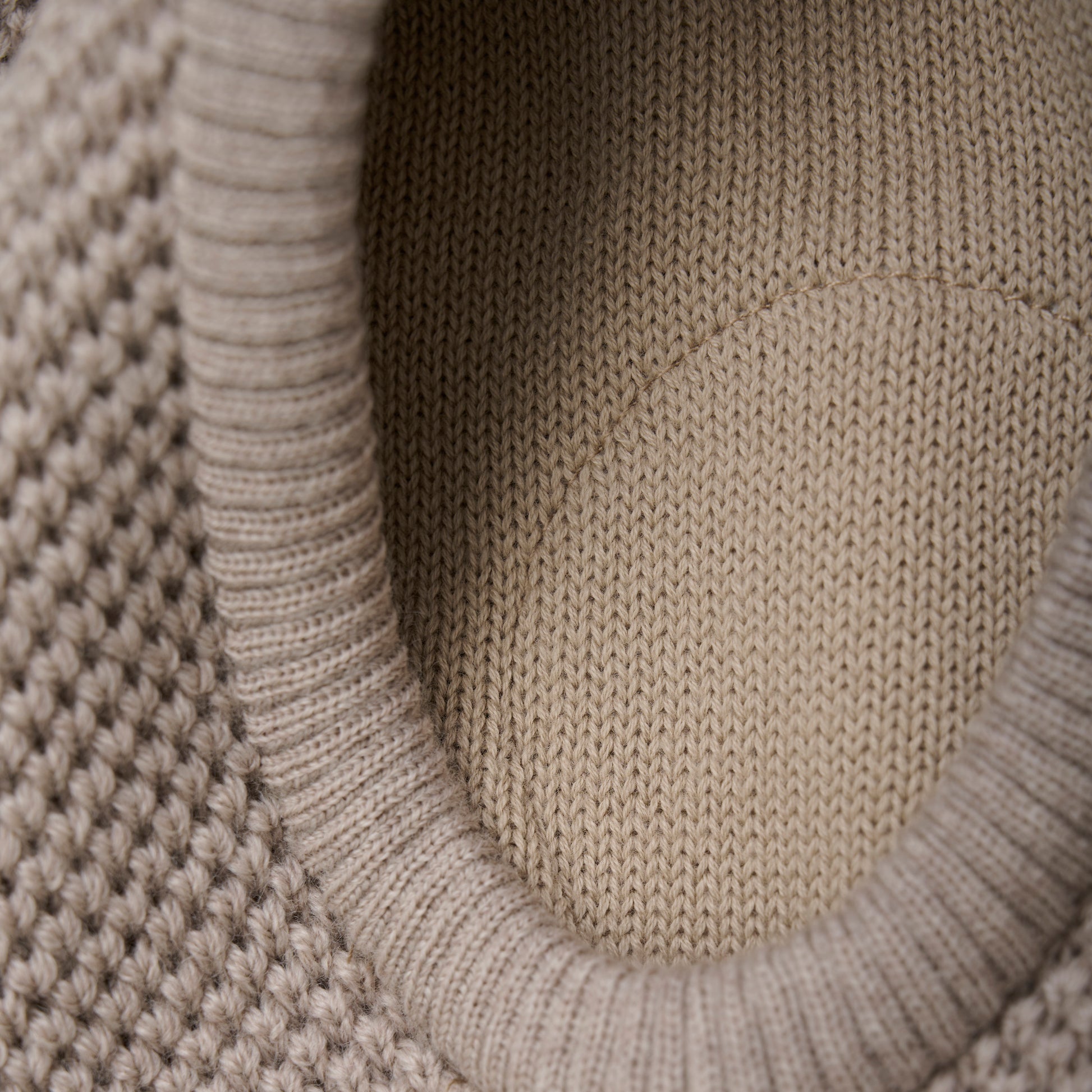 HUTTEliHUTs strikkede ullbalaclava er et ideelt valg for å holde barnet ditt varmt og beskyttet på kalde vinterdager. Laget av myk og varm ull, gir denne balaclavaen både utmerket isolasjon og komfort. Den strikkede teksturen gjør at den puster, samtidig som den beskytter mot kulde og vind, og dekker både hodet, ørene og halsen.