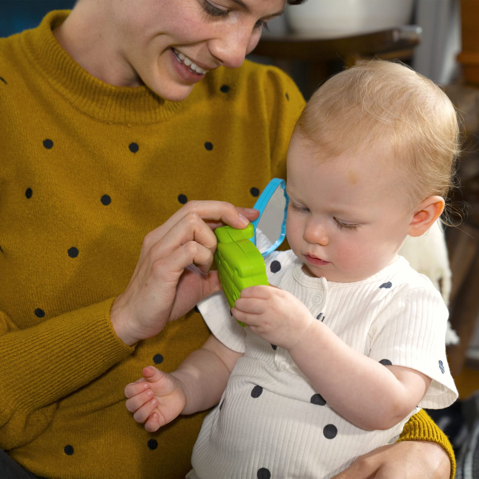 Denne Ocean Explorers musling-mobil fra Baby Einstein lar barn utforske havet med alle sanser. Ved å trykke på knappene kan din baby spille av melodier, høre havets lyder og lære fargene på tre forskjellige språk. Babyspeilet motiverer din baby til å oppdage sitt eget speilbilde. Muslingmobilen lyser i takt med rytmen for å fremme forståelsen av årsak og virkning, har den perfekte størrelse til små hender og vil raskt bli barnets favorittleke.